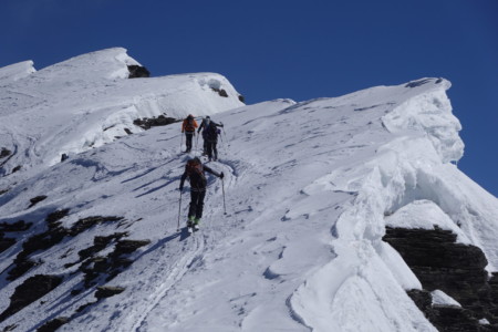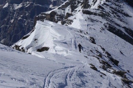 Le groupe entame l’ascension dans une ambiance motivée, mais rapidement la réalité des conditions nous rattrape : la neige, encore dure et gelée en matinée, complique la progression. Au début de la Zackengrat, un membre du groupe jette l’éponge, il a laissé le couteau à Soleure. Malgré les efforts fournis des autres membres du groupe, personne n’atteindra le sommet cette fois-ci. La prudence aura eu raison de l’ambition.