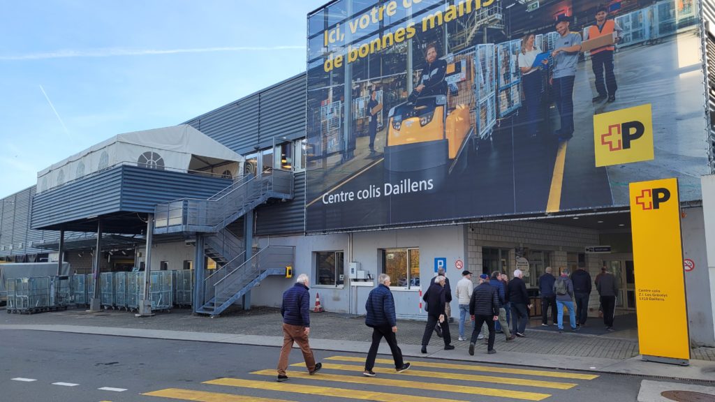Nous déambulons parmi des centaines de mètres voir des kilomètres de tapis roulants sur lesquels circulent les colis. Dès le départ du premier tapis, des employés déchargent les RX (RX = chariots métalliques sur roulettes) en prenant soin de placer l’étiquette en haut, il n’y a pas de robots pour effectuer ce travail. Quelques mètres après, l’adresse est lue par un système électronique et sera dès lors acheminé pour terminer sa course dans la glissière correspondante à sa destination. Un certain pourcentage de colis ne peut pas entrer dans le système ; colis trop longs, trop lourds, encombrants, rouleaux, cartons de vin, etc… Il existe également l’hôpital à colis : c’est un endroit où sont pris en charge les colis endommagés, adresses illisibles, cartons écrasés, etc… Les employés de ce service font le maximum pour remettre sur pied ces colis. Il est presque midi ! c’est le moment de remercier et de prendre congé de nos aimables guides. Notons au passage que les visites de ce Centre sont totalement gratuites.