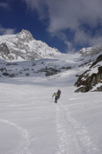 C’est donc après un voyage sans histoire que nous partons de La Fouly un peu après 7h00, skis au pied. La pente est douce ce qui offre l’occasion de discuter tranquillement. Ensuite, premier obstacle à la Pierre Javelle (2090 m). Une pente plus raide oblige à déchausser et à gravir quelques mètres en portant les skis (photo 1).