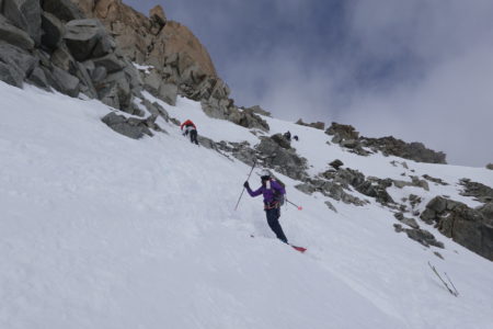 Il faut enfin franchir la rimaye, déposer les skis et chausser les crampons avant d’entamer les derniers mètres qui nous font parvenir à une courte arête avant d’atteindre le sommet.