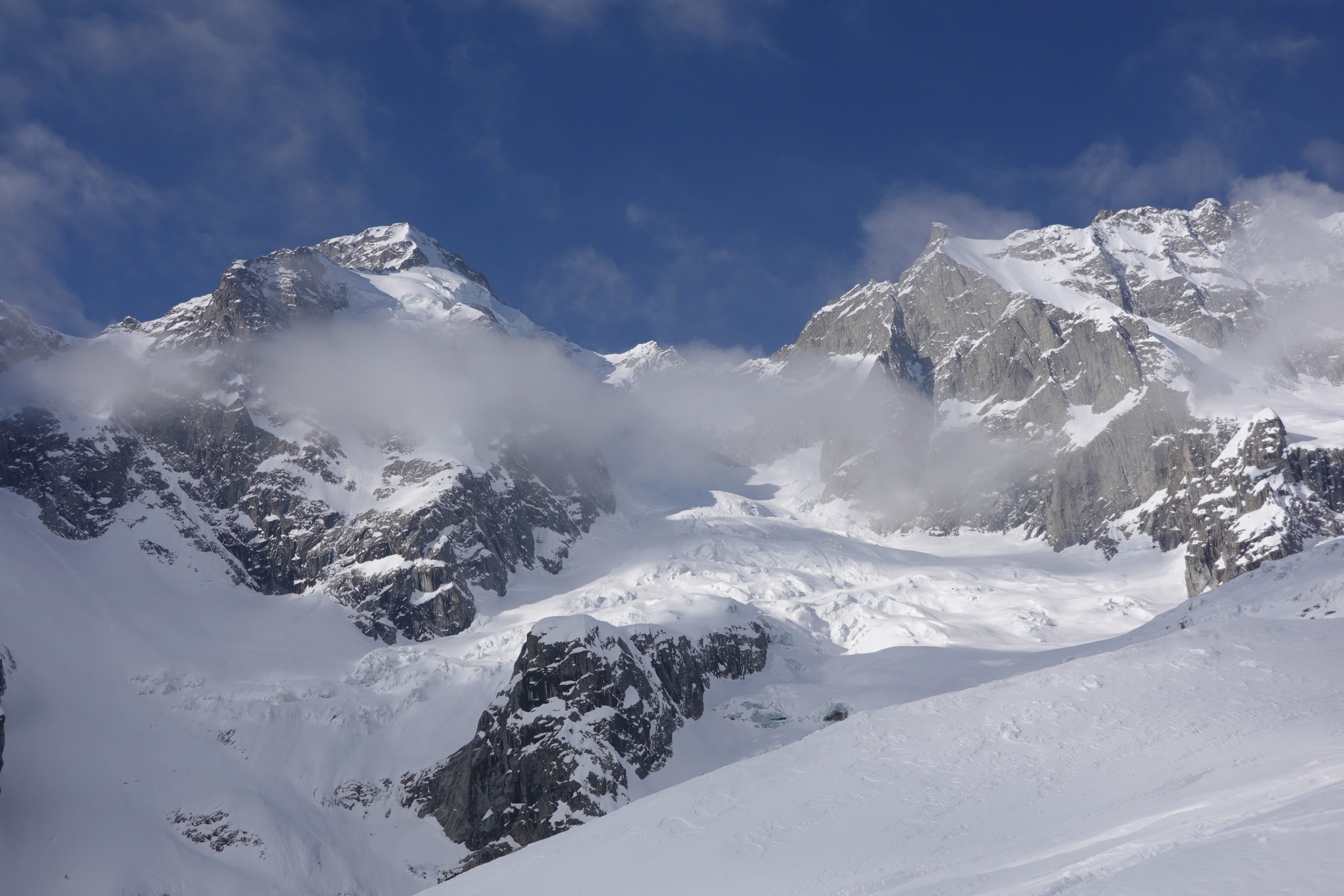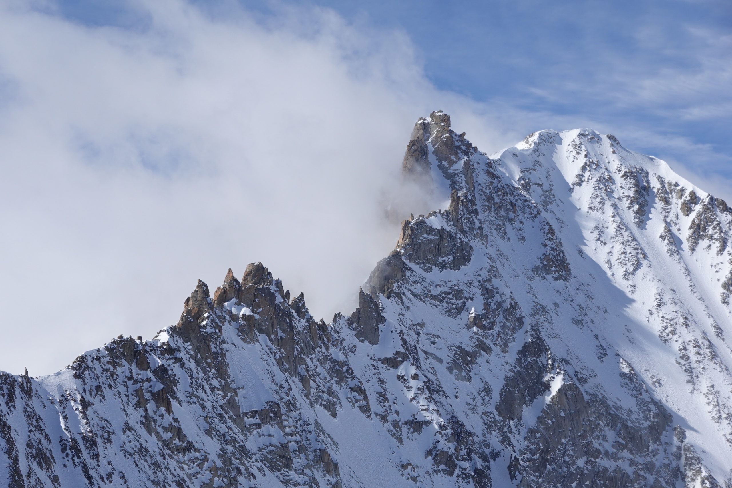 Nous poursuivons ensuite par des pentes régulières jusqu’à hauteur de la cabane de l’A Neuve (2734 m, fermée à cette saison) qui se confond admirablement avec son environnement. Nous avons ainsi parcouru un peu plus de la moitié de la montée. Nous arrivons sur le glacier (avec cette neige on ne voit à vrai dire pas la différence) puis la pente se redresse un peu dans une traversée à gauche qui nous fait aboutir sur un plateau glaciaire au pied de la Grand-Luy. Le Tour Noir se dresse fièrement à gauche, ainsi que derrière nous le Dolent (photo 2), qui nous a accompagné durant la montée. Nous avons pleinement conscience de nos jambes qui se contractent parfois désagréablement pour certains sous l’effet d’une crampe.