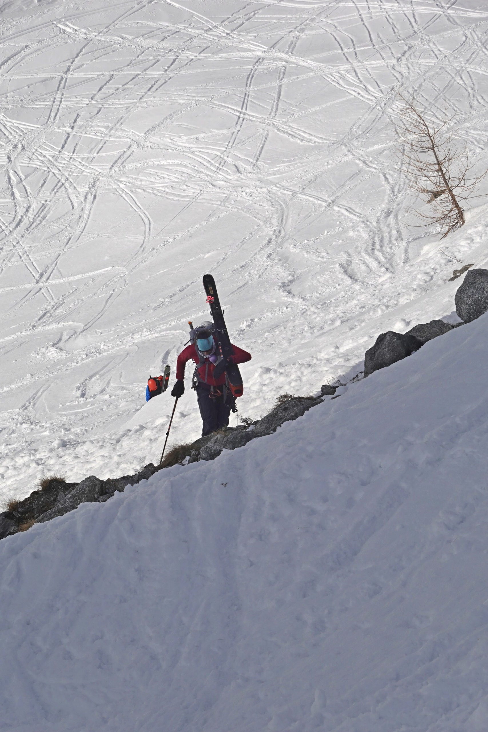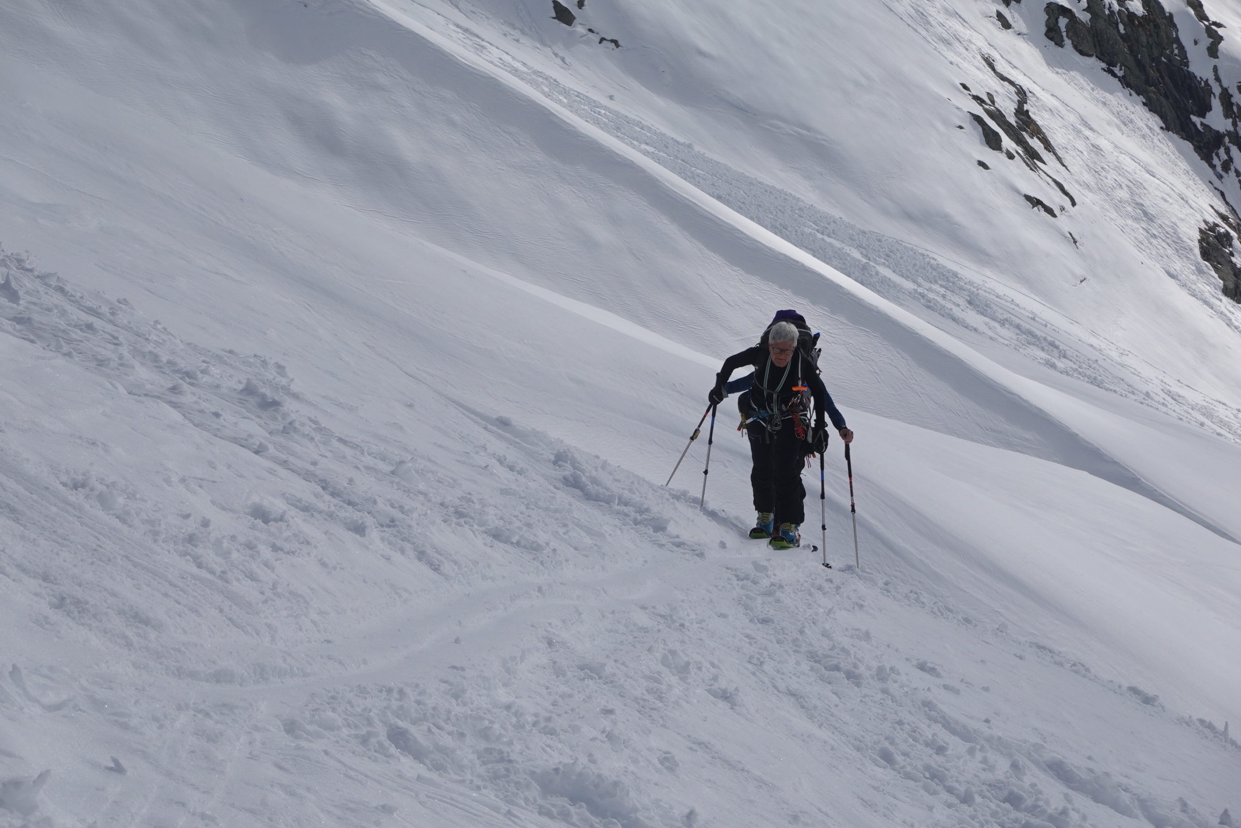 C’est donc après un voyage sans histoire que nous partons de La Fouly un peu après 7h00, skis au pied. La pente est douce ce qui offre l’occasion de discuter tranquillement. Ensuite, premier obstacle à la Pierre Javelle (2090 m). Une pente plus raide oblige à déchausser et à gravir quelques mètres en portant les skis (photo 1).