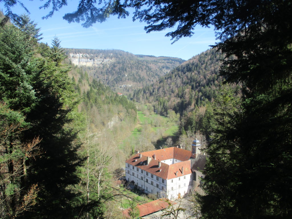 Arrivé au bas de la vallée, nous découvrons la source du Dessoubre qui se jette après 33 km dans le Doubs à St. Hippolyte. Nous pique-niquons dans la cour du Monastère et surprise…. la buvette est ouverte, Antonio nous offre le café et les glaces. Merci Antonio !!