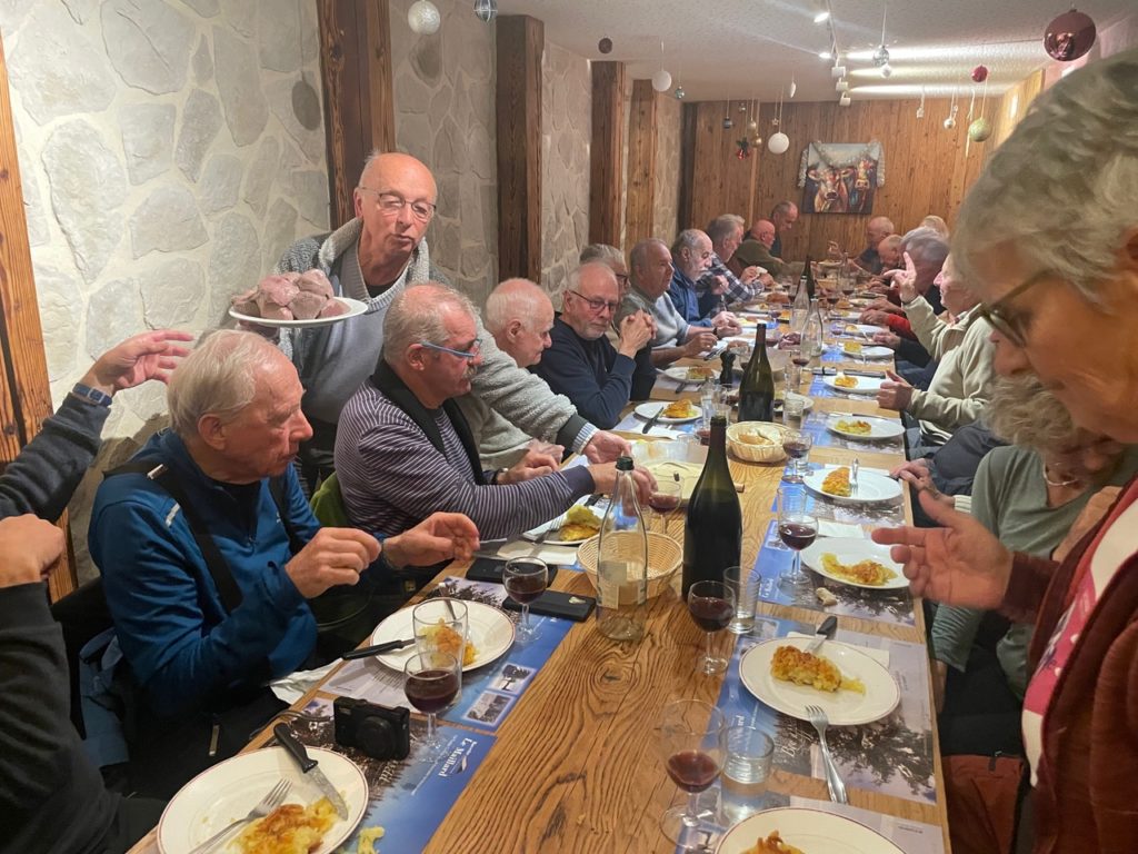 Après l’apéro pris en terrasse, toute l’équipe se retrouve dans une salle juste assez grande pour nous accueillir pour un bon repas. Avec les excellents röstis maison, les filets de bœuf, à saisir sur ardoise, permettaient à chacun de doser sa cuisson préférée. Les desserts (toujours maison) ont remporté un grand succès.