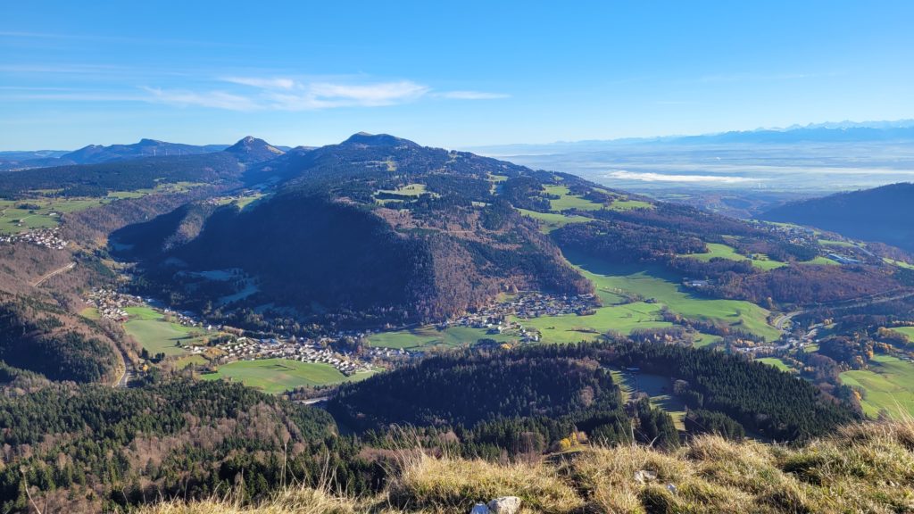 Les 5 Tamalous inscrits débutent la course avec les Seniors et se rendent en voiture jusqu’au parking du Mont d’Or. Le brouillard sera de la partie tout au long de la Vallée de La Sagne et d’une bonne partie du Val-de-Travers. A destination, les organisateurs ont dressé une table avec café, tresse, beurre et chocolat. Tout le monde grimpe ensuite au sommet du Mont d’Or. Les rochers rappellent ceux du Creux-du-Van, en plus modeste évidemment. Le panorama est exceptionnel : Lac Léman, Lac de Neuchâtel, Mont-Blanc, sommets jurassiens vus d’un angle un peu inhabituel, ainsi que Vallorbe et ses environs, tout cela sous un ciel d’azur parsemé de quelques traînées de nuages et gribouillé de nombreuses traces d’avions de ligne. Les Seniors continuent à pied tandis que nous rejoignons les voitures pour descendre jusqu’au parking de La Boissaude. Notre itinéraire pédestre à travers de magnifiques pâturages boisés nous amènera aux Granges Raguin en passant par La Roulette, Le Chalet Brûlé, Le Haut Soulier. En chemin, nous croisons plusieurs convois impressionnants de longs bois avec immatriculations polonaises. Aux Granges Raguin où les Seniors nous rejoignent, nous prenons l’apéro dehors. Le repas sera typique du terroir : Mont d’Or chaud, saucisse de Morteau, jambon cuit, salade, dessert et café. L’après-midi, nous rejoignons les voitures à la Boissaude par un chemin un peu raccourci.