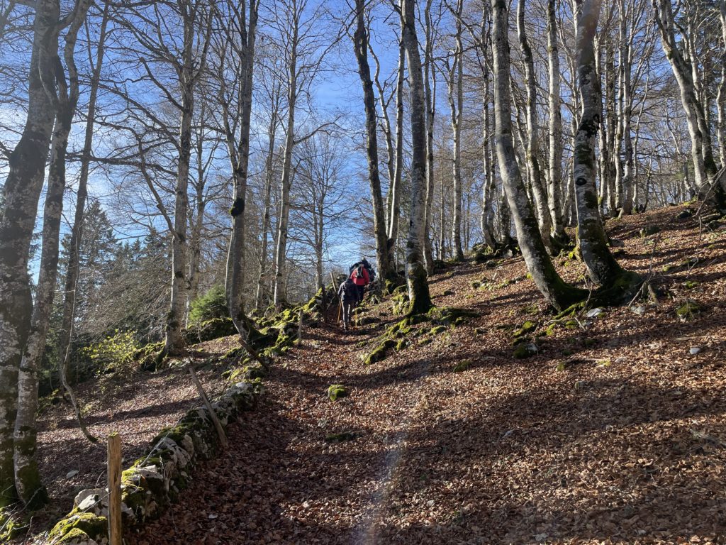 Après avoir suivi le bord de la falaise, nous longeons la frontière avec la Suisse et descendons en direction de la Petite Echelle. Une ou deux inattentions du coordinateur de tête nous a permis d’avancer et de revenir sur nos pas puis, de traverser un bout de forêt envahis de taillis tels des aventuriers en Amazonie.