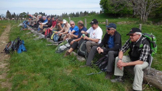 Le Mont Vouillot se situe au Nord de Morteau à 1158 m. d’altitude. De là, nous jouissons d’une vue imprenable sur toute la chaîne du Jura allant du Chasseron à l’Ouest jusqu’aux sommets du Jura soleurois. Malheureusement une brume compacte nous empêche d’apercevoir les Alpes. – Déplacement en voitures jusqu’aux Fins (café croissants) et de là, marche sur de bons sentiers forestiers en passant par « Chez Fraichot » et « Derrière le Mont Vouillot » pour arriver au sommet. Il est midi, c’est l’heure de l’apéro et du pique-nique qui s’ensuit. Petite brise fraîche mais un soleil généreux toute la journée. Descente par les hauts de Morteau pour rejoindre Les Fins