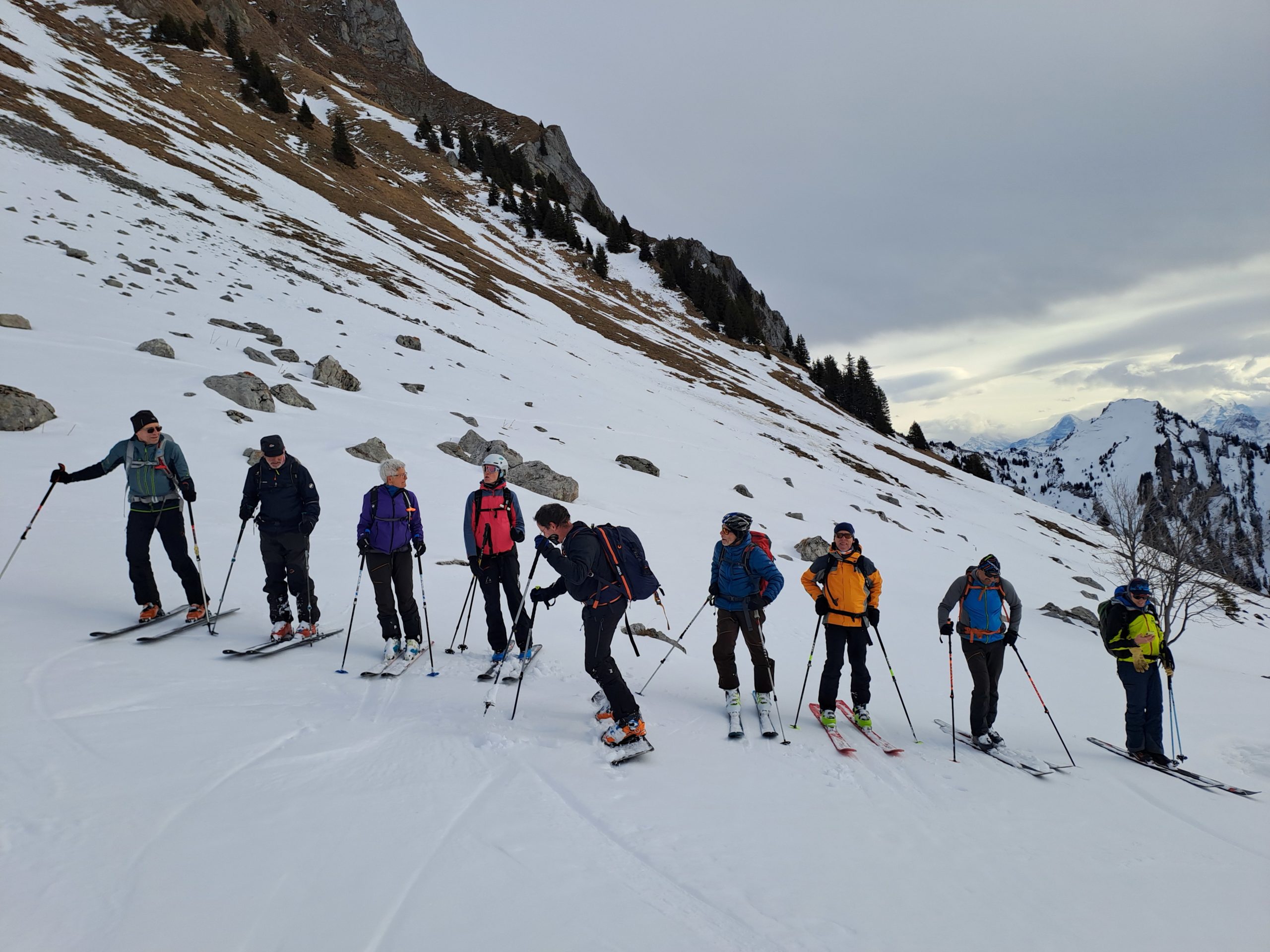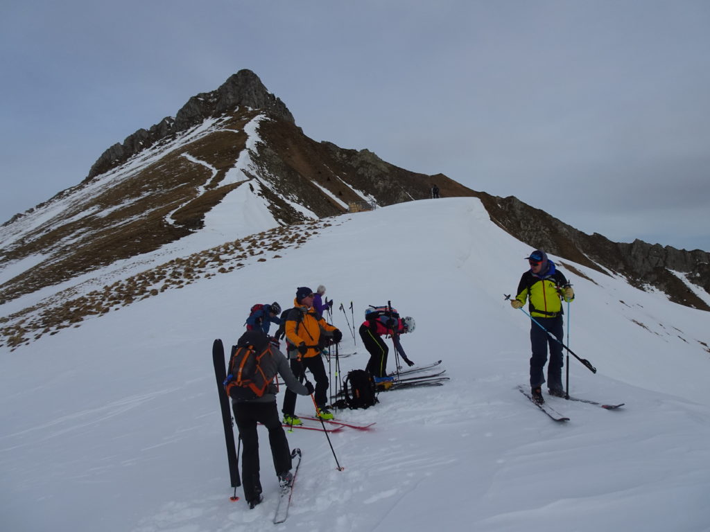 Les conditions avalancheuses étant annoncées au niveau 2+ dans la région du Gantrisch, nous pouvons nous lancer pour cette journée de rando dans les Préalpes. Nous nous retrouvons sur la route du Gürnigelpass au lieux dit « Hengst » et malgré le manque évident de neige, nous pouvons chausser les skis. La montée à l’Ochse s’effectue par l’alpage Mittelalpigle et le col Alpiglegalm à 2016 m, bien que le sommet ne soit qu’à moins de deux cent mètres de dénivellation, nous décidons de continuer sans y monter car il est complètement dépourvu de neige.
