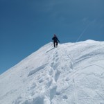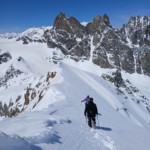 Nous progressons rapidement le long glacier d’Arolla direction le Col Collon à la frontière italienne. Une fois celui-ci atteint, la pente se redresse direction le Mont Brûlé. La pente est longue et soutenue et celle-ci nous amène au dépôt de skis juste avant la Pointe Kurz. Une fois les crampons chaussés, nous poursuivons le long d’une fine arrête de neige jusqu’au sommet. Le vue est magnifique sur le Cervin, la Dent d’Herens et la Dent Blanche. Le Mont Brûlé nous contemple mais celui-ci semble encore loin pour aujourd’hui.
