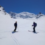 Nous attaquons la descente d’abord par l’arrête puis par la face NE relativement raide qui nous offre du super ski. La descente du glacier d’Arolla nous amène au plan Bertol où nous profitons de manger.