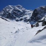 Après un départ à 04.00 du Val-de-Ruz, l’équipe se retrouve à Arolla et se met en route vers 07.00 direction Plan Bertol. La neige à Arolla est exceptionnelle pour cette saison. A la prise d’eau nous constatons que toute la largeur de la face W des dents de Bertol est striée d’une cassure impressionnante. Une avalanche a ravagé la face. Nous décidons une fois de plus de changer de plan et de passer au plan C.